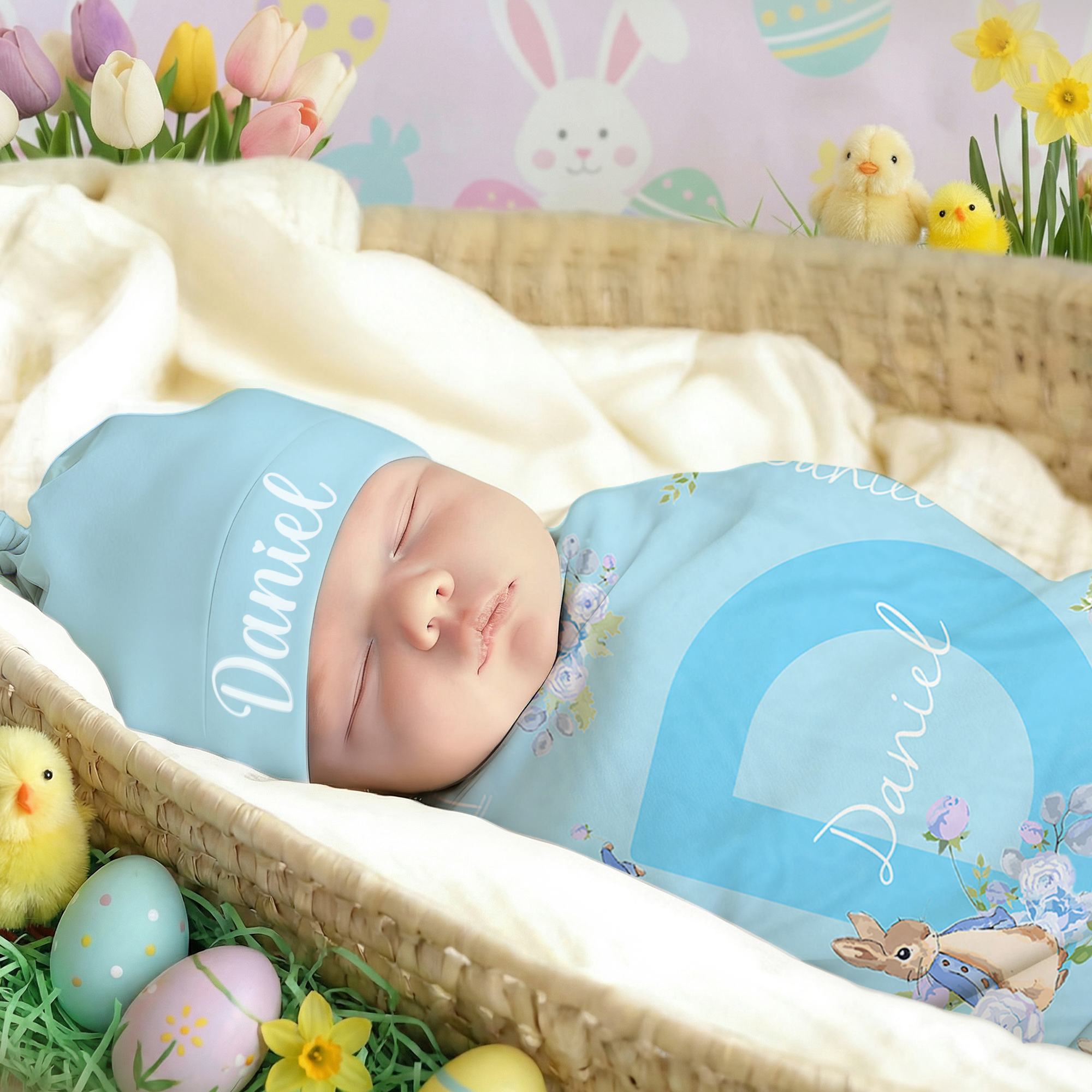 Custom Name Peter Rabbit Bunny Alphabet Receiving Blanket with Hat, Swaddle & Hat Set for Baby Girl Boy, Birthday/Baby Shower/Easter Gift for Newborns